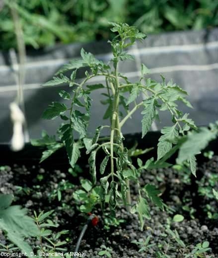 Como o próprio nome sugere, Ralstonia solanacearum leva a um rápido murchamento das folhas jovens nas horas mais quentes do dia, muitas vezes reversível inicialmente à noite (figuras 1 a 4). Posteriormente, as murchas aparecem repentinamente e se tornam permanentes. Observe a total ausência de sintomas nos frutos. Rapidamente, os tecidos afetados necrosam e secam, e muitas plantas eventualmente morrem. Sintomas menos típicos podem aparecer, especialmente em condições pouco favoráveis à murcha bacteriana: crescimento lento das plantas, epinastia foliar, emissão de contornos de raízes adventícias no caule, amarelecimento das folhas inferiores, etc. Esses diferentes sintomas podem aparecer nas mudas jovens no viveiro do que em plantas adultas. As raízes poderiam sofrer com a presença de R. solanacearum : um número crescente delas apodreceria .