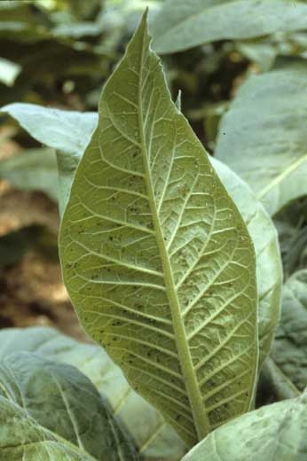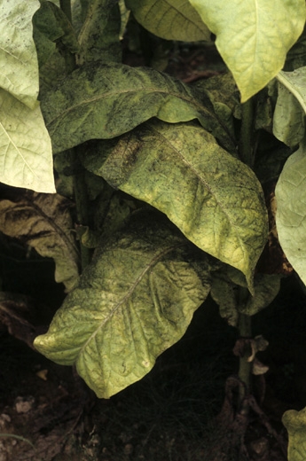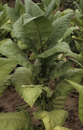 Plusieurs feuilles de tabac ont un aspect terne et semblent couvertes de suie. <b>Fumagine</b>
