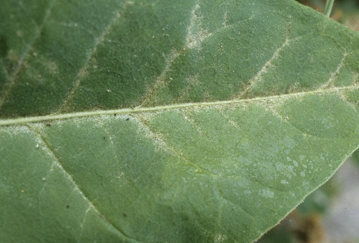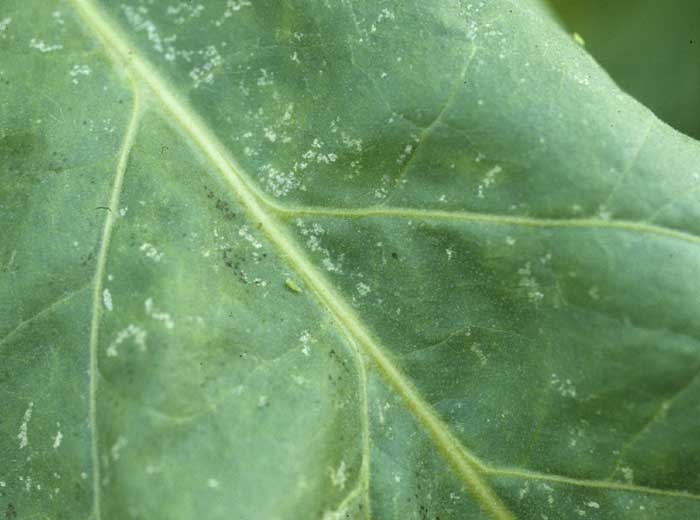 As nervuras e tecidos proximos são cobertos com uma infinidade de pequenas manchas prateadas, pontilhadas com excrementos escuros, localmente dando uma cor acinzentada à lamina. <b>Dano por thrips</b>.