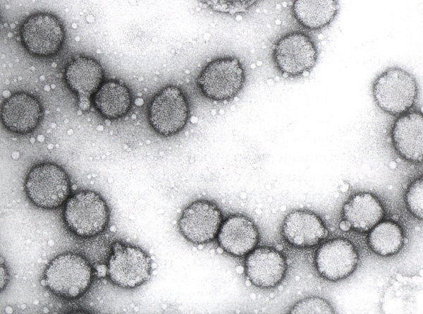 Les particules du <b>virus de la maladie bronzée de la tomate</b> (<i>Tomato spotted wilt virus</i>, TSWV) sont sphériques, de 85 nm de diamètre. La présence d'une enveloppe lipidique leur confère un aspect particulier.