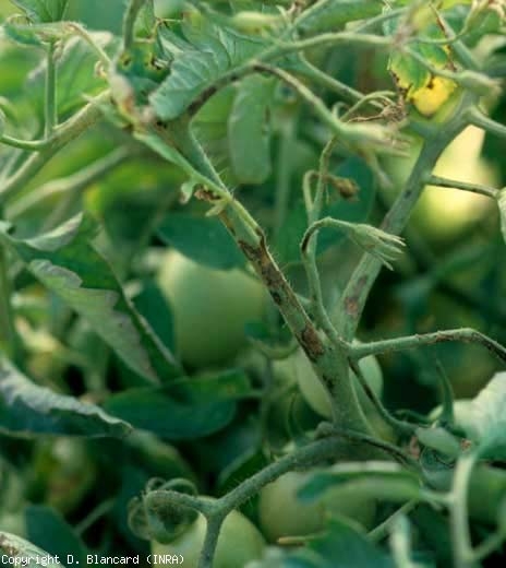 São observadas lesões castanhas nos caules. <b><i>Pseudomonas syringae</i> pv. <i>tomato</i></b> (salpicado, bacterial speck)