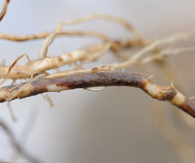 A suberização logo se generaliza. Algumas mangas de Liège são rachadas. <i><b>Pyrenochaeta lycopersici</b></i> (raízes de Liège, corky root)