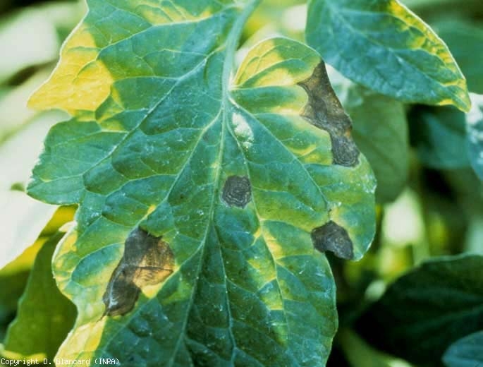 Manchas angulares e necróticas mais antigas, um halo amarelo mais ou menos brilhante os rodeia (devido aos efeitos de uma toxina) <i><b>Alternaria tomatophila</b></i> (alternariose, early blight)