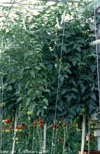 Este folheto de tomate revela manchas verdes escuras irregulares e mais ou menos em relevo, contrastando com o resto do limbo prateado. Este sintoma não deve ser confundido com um mosaico viral. <b>Prata</b> (prata)